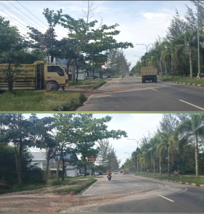 Hingga saat ini atau sekitar pukul 16.30, belum terlihat adanya upaya pembersihan jalan secara maksimal maupun penertiban terhadap kendaraan pengangkut material yang melintas di kawasan tersebut.