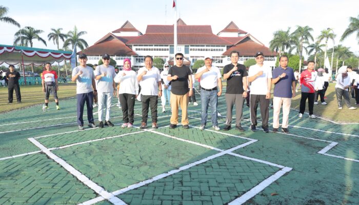 BABELPRIME, PANGKALPINANG- Gubernur Kepulauan Bangka Belitung (Babel), Hidayat Arsani mengikuti kegiatan senam sehat dalam kegiatan Undian Tabungan Pesirah Bank Sumsel Babel Periode Januari 2025-Desember 2025 di Halaman Kantor Gubernur Babel pada Minggu (5/4/2026) pagi.